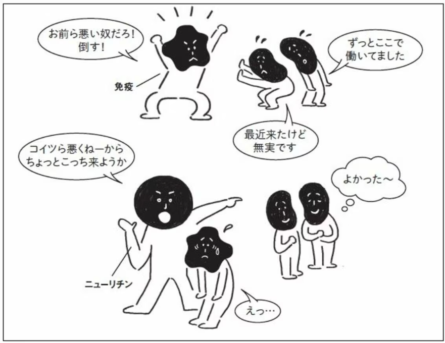このような誤作動を完全に制御することは難しく、これまでは免疫力全体を落とすしかなかったのですが、最近の研究で、免疫の理解が一歩進み、ニューリチンという物質がこれらの好ましくない免疫反応を上手に抑えることがわかりました。