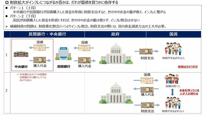 財政支出の際は、誰が国債を買うかで、インフレになる可能性は変わってくる。日銀や民間銀行が購入するとお金が増えてインフレになりやすいが、国民が直接引き受けるならインフレは抑制される可能性が高い。また、国債発行や財政の活用方法についての民間の意識が高まる効果も期待できる。全てと言うわけにはいかないが、個人向け国債は増やすべきだろう。