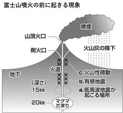 鎌田氏によると、最初に起こるのは、低周波地震と呼ばれる小さな地震だ。富士山には山頂から20キロ地下に「マグマだまり」と呼ばれるマグマに満たされた場所がある。マグマが活動を始まると、マグマだまりの上部、地下15キロ付近で小さな地震が起きる。