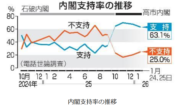 高市内閣の支持率は63・1%で、昨年12月の世論調査から4・4ポイント低下した。不支持は25・0%だった。