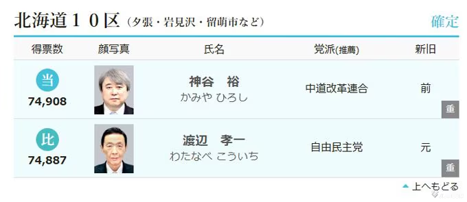 そして今回は、中道から出馬した神谷氏と自民・渡辺孝一氏の一騎打ちで、得票はそれぞれ、7万4908票(同50.0%)、7万4887票(同50.0%)。神谷氏がわずか21票差で逃げ切った。神谷氏には、学会の組織票が加わったにもかかわらず、得票率を低下させた。