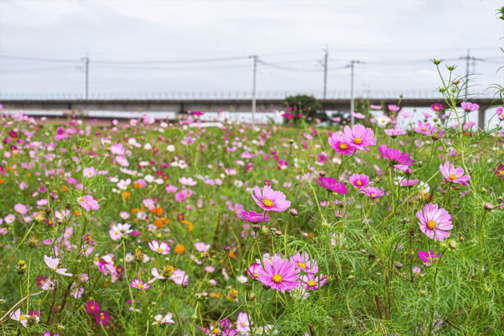 約3ヘクタールの敷地には、シーシェル、ピコティなど22種類が植えられており、赤やピンク、白などの花が咲き誇っている。世話をしているNPO法人によると、今年は夏の暑さが心配されたが、適度な降雨に恵まれ順調に育った。遊歩道が整備されており、訪れた人たちは散策を楽しみながらスマートフォンを向けていた。