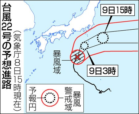 非常に強い台風22号は8日午後、伊豆諸島の南西海上を北上した。気象庁は午後4時50分、八丈島(東京都八丈町)と青ケ島(青ケ島村)に暴風と波浪の特別警報を発表した。22号は9日明け方から朝にかけて接近し、一部の住宅が倒壊するような猛烈な風が吹くとみられ、同庁は安全を確保するよう呼び掛けている。