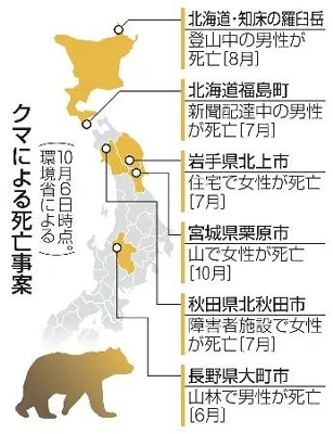 環境省によるとクマによる犠牲者は6日時点で北海道で2人、岩手、宮城、秋田、長野で各1人の計6人。被害場所は登山やキノコ採りで訪れた山中だけでなく、岩手県北上市では住宅で女性が襲われ、北海道福島町では新聞配達中の男性が、秋田県北秋田市では障害者施設の敷地内で女性が被害に遭うなど、人の生活圏にも及んだ。
