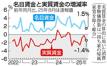実質賃金、8カ月連続マイナス 1.4%減、物価高で―8月