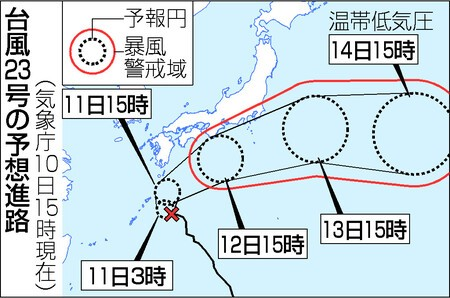 23号は12日には四国や紀伊半島の南海上を東北東へ進み、同日夜から13日朝までの間に伊豆諸島の八丈島などに接近する恐れがある。接近時は暴風に厳重な警戒が必要という。