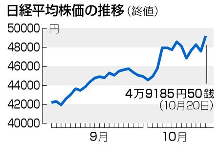 東京株、史上初の4万9000円台 自維連立の実質合意で