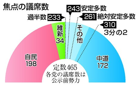 高市早苗首相(自民党総裁)は衆院選の目標を、日本維新の会との与党で定数465の過半数となる233議席と設定した。政権維持に最低限必要な数と言える。これを上回り「安定多数」と呼ばれる243を得ると、17ある常任委員会の委員長ポストを独占できる。大幅に伸び定数の3分の2となる310に達すれば、少数与党の参院で法案を否決されても、衆院で再可決が可能になる。