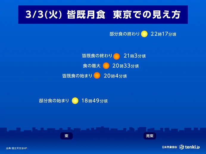 来週3月3日(火)の夜に、皆既月食が起こります。全工程が観測しやすい時間帯で、月は東の空で18時50分に欠け始め、20時04分に皆既食となります。皆既食は21時03分に終わり、その後は徐々に欠けた部分が小さくなっていき、22時18分に、南東の空で部分食が終わります。